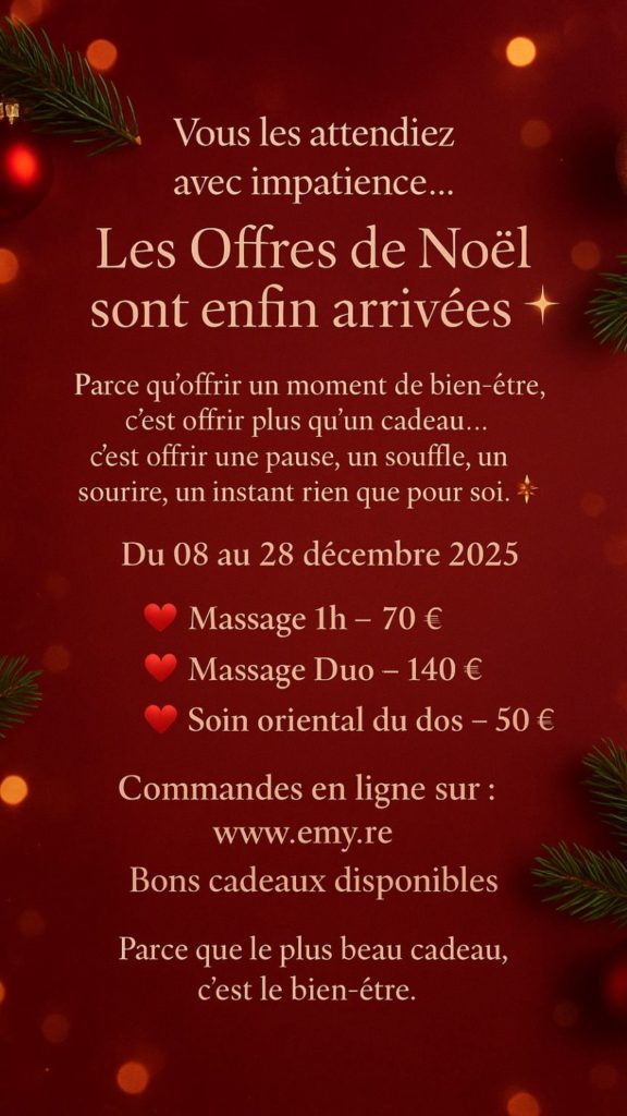 Les Offres de Noël sont enfin arrivées. Du 8 au 28 décembre, Tous les massages à 70€ / Massage Duo à 140€ au lieu de 160€ / Soin Oriental du dos à 50€ au lieu de 59€